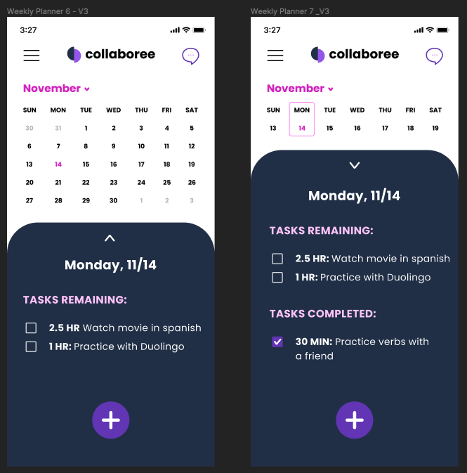 I chose to prioritize a second user flow to help support the functionality my users need to successfully learn a new skill (being able to log activity) and show how that information input is impacted across the rest of the UI.
