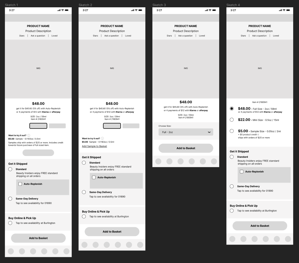 At the mid/low-fidelity stage, I sketched a few different ways user’s could shop for samples to understand what would best support my user flow, ensuring my high fidelity designs would be ready to test with users.