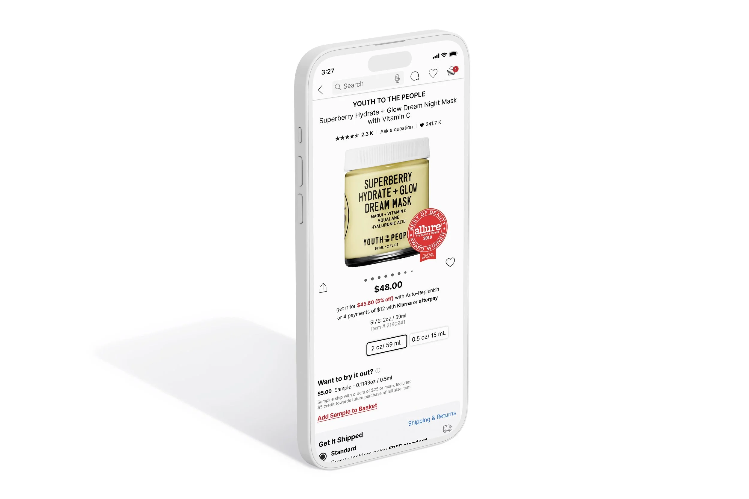 During my initial competitor analysis, I discovered that many of Sephora’s direct competitors do not offer a feature to purchase samples. Sephora would be among the first to pioneer this idea, giving them a unique advantage to test and perfect the feature. Some beauty brands, like Kosas.com, offer purchasable sample options on their website directly, but I did not find this on any other third-party beauty marketplace platform.